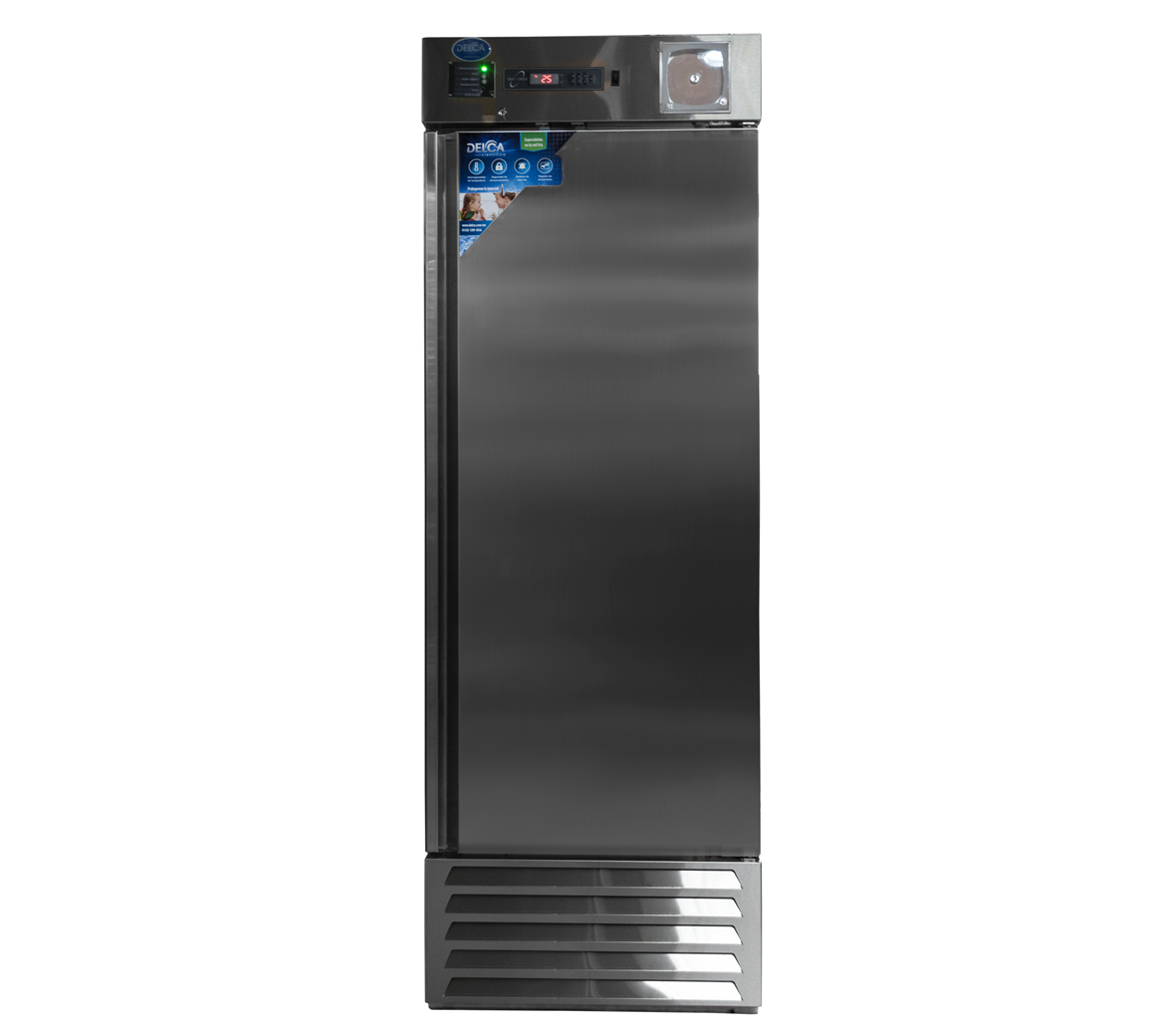 | Material | Paneles internos y externos en acero inoxidable 304; aislamiento de ciclopentano libre de CFC; congelador de aluminio con puerta inox; parrillas, ménsulas y cremalleras inox; empaque magnético de hule grado sanitario. |